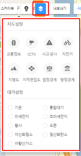 카카오맵의 레이어 기능에는 교통정보 / CCTV / 사고,공사 / 자전거 / 지형도 / 지적편집도 / 법정경계 / 행정경계에 대한 정보를 표시하여 확인할 수 있습니다. 또한, 대기설정에는 (기온, 통합대기, 미세먼지, 초미세먼지, 황사, 오존, 이산화질소, 일상화탄소, 아황산가스)에 대한 정보를 표시하여 확인할 수 있습니다.