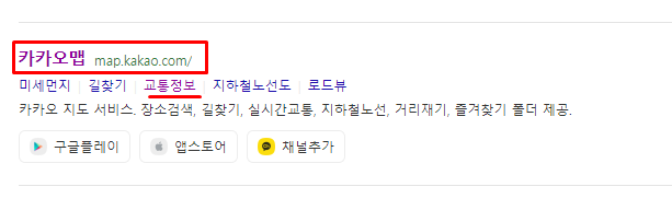 카카오맵 공식 홈페이지를 이용하는 방법도 있지만, 교통정보를 선택하는 방법도 있습니다. 위 사진에서 표시된 것과 같이 다음 검색에서 결과로 나타나는 사이트 정보에서 [교통정보]를 선택하여 확인할 수도 있습니다. 여기서는 공식 홈페이지를 이용하여 이야기를 이어갑니다.