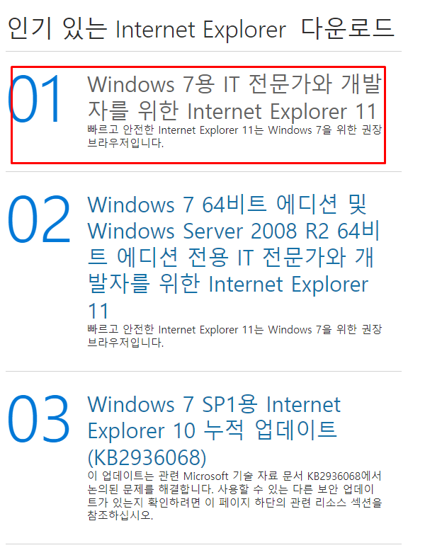 4번에서 연결되는 페이지에는 '인기 있는 Internet Explorer 다운로드'에 관련된 항목을 확인할 수 있습니다. 사용자의 필요에 맞는 항목을 선택하면 됩니다. 여기서는 첫번째를 선택하여 이야기를 이어가도록 합니다.