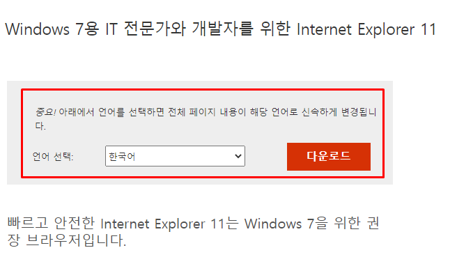 연결된 페이지에서는 IE의 언어를 선택한 후, [다운로드]를 진행할 수 있습니다.