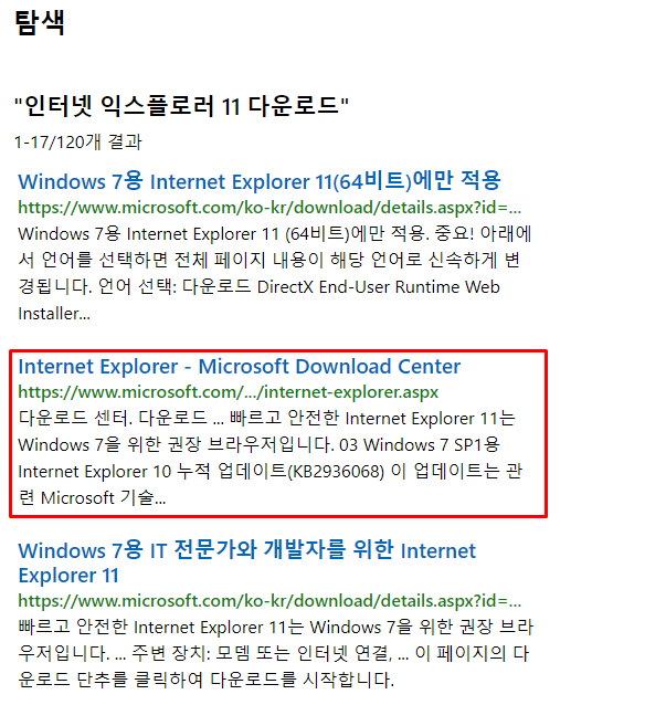 3번의 검색을 통해 확인되는 결과에는 다양한 자료가 보여지게 됩니다. 여기서 'Internet Explorer - Microsoft Download Center'를 선택합니다. 물론, 개인의 취향에 따라 다른 자료를 선택할 수도 있습니다. 다만, 제가 추천하는 자료를 선택하면 관련 자료를 항목으로 나열한 정보를 얻을 수 있어 편리하기도 합니다.
