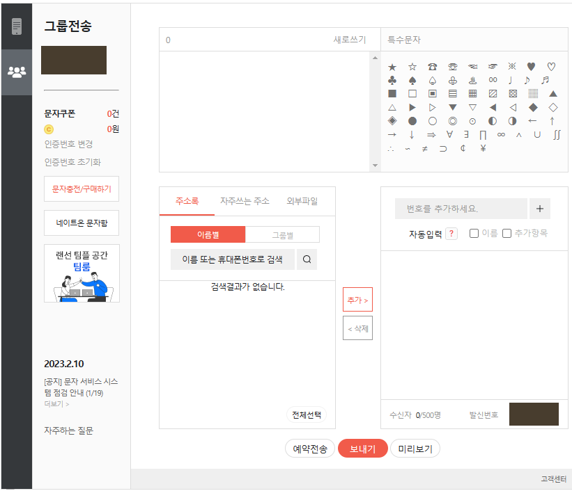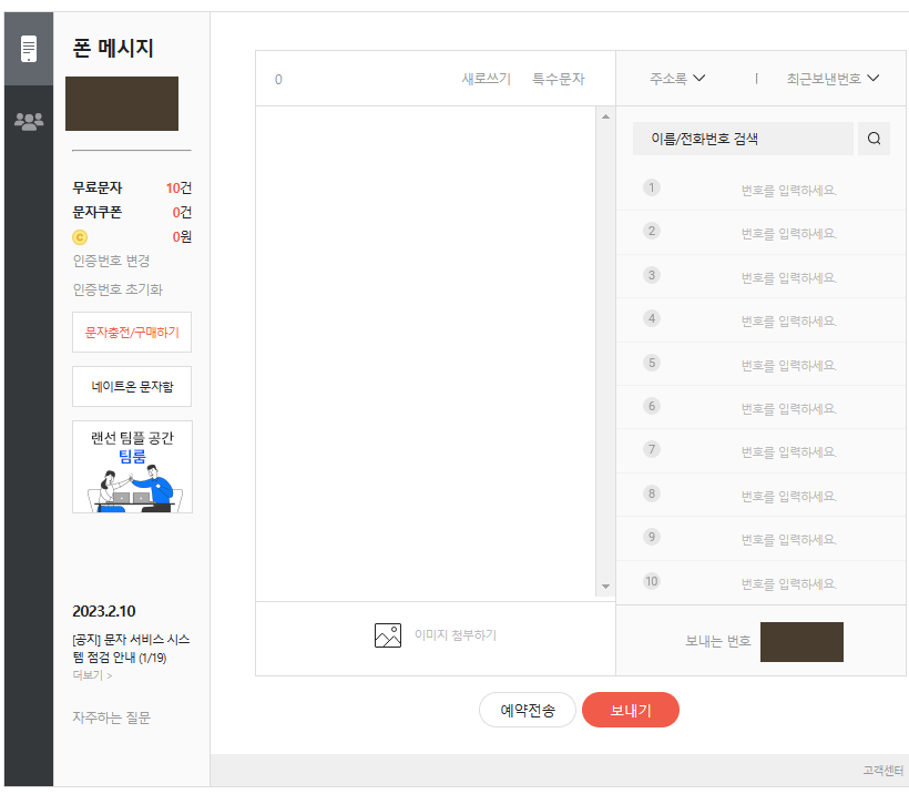 위 사진은 네이트온에서 실행한 '문자메시지'기능을 선택했을 때, 볼 수 있는 웹페이지 모습이기도 합니다. 폰 메시지, 그룹 전송을 할 수 있는 기능을 제공하고 있습니다. 등록된 휴대전화의 통신사에 따라 지원되는 무료 메시지 개수는 차이를 보이기도 합니다.