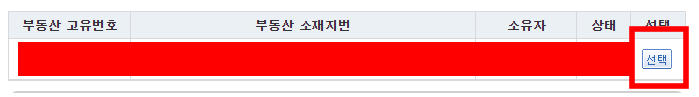 선택을 클릭하면, 집합건물의 전유세대 부동산 소재지번 선택으로 내용이 변화합니다. 항목의 내용을 꼼꼼히 살펴 원하는 것과 일치하는지 확인합니다. 일치한다면 [선택]버튼을 클릭합니다.
