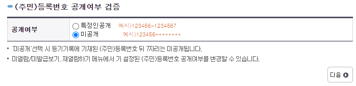 다음으로 나타나는 것은 '등록번호 공개여부 검증'에 대한 내용입니다. 특정인공개 / 미공개로 설정할 수 있습니다. 사진에도 예시가 있는데요. 미공개로 하면 일부 내용은 별표로 대체되어 표시되게 됩니다.