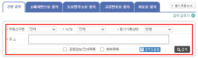 간편검색으로 부동산 물건을 찾기 위해서는 몇가지 내용을 기입해야만 합니다. 홈페이지에서 요구하는 것으로 [부동산구분, 시/도, 등기기록상태, 주소]의 내용을 기입해야 정확하게 대상 물건을 찾을 수 있습니다.