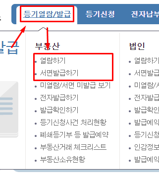인터넷 등기소에서는 다양한 기능이 있습니다. 부동산 등기, 법인 등기 등에 대한 기능을 지원하고 있습니다. 본 포스팅의 핵심인 등기부등본을 인터넷으로 열람 및 발급하는 것도 가능합니다. 해당 기능을 찾는 방법은 2가지가 있습니다. 첫번째의 경우 상단 메뉴바에서 [등기열람/발급 > 열람하기 또는 서면발급하기]를 선택합니다.