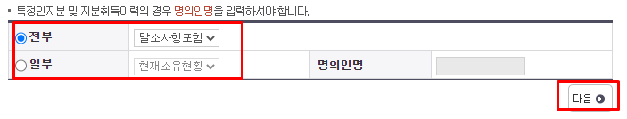 다음 화면에서는 등기기록 유형을 선택하게 됩니다. 전부 / 일부로 선택할 수 있는데요. 전부를 선택하여 확인하는 것이 많은 정보를 얻을 수 있기에 좋을 것 같습니다. 선택을 완료했으면 [다음] 버튼을 클릭합니다.
