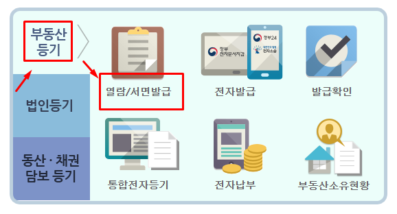 두번째 방법으로는 메인 화면의 중간에 있는 아이콘을 참고하여 기능을 찾는 방법이 있습니다. 메인 화면 중간에 있는 영역에서 [부동산 등기 > 열람/서면발급]을 선택합니다.