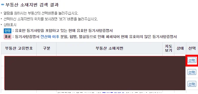 검색한 결과는 검색 정보에 따라 많을 수도 있습니다. 물건 정보의 목록은 페이지 아래에 나타나게 되는데요. 여기서 찾고자 하는 물건의 항목을 찾아 [선택] 버튼을 클릭합니다.