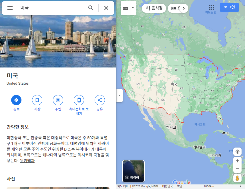 위 지도는 '미국'이라는 큰 단어로 구글 지도를 검색한 결과를 나타내는 예시 참고 사진입니다. 기본적으로 '경로, 저장, 주변, 휴대전화로 보내기, 고유'에 대한 기능을 지원하고 있습니다. 그 아래에는 '간략한 정보'에 대한 내용이 나타나며, 지역을 대표할 수 있는 사진 정보도 포함되어 있습니다.