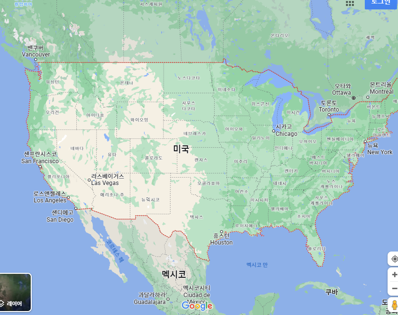 구글 지도에서 지역을 검색하기 위해서는 지역명을 입력하면 됩니다. 다만, '미국'과 같이 나라 이름으로 검색하면 대륙을 포함한 나라 전체를 보이게 됩니다. 즉, 상세한 지역의 정보를 확인하기에는 어려울 수 있습니다. 이런 경우, 구글 지도에 있는 확대 및 축소 기능을 이용하면 도움이 될 수 있습니다. 우선 전체 모습을 살펴봅니다. 아래 사진을 참고해 주세요.