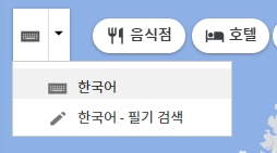 위 사진과 같은 검색 기능 영역에 원하는 지역을 입력한 후, 엔터 혹은 돋보기 아이콘을 선택합니다. 또한, 검색 기능 오른쪽에 있는 키보드 모양을 선택하면 입력하는 방법을 바꿀 수 있습니다. 기본 설정은 키보드 입력인데요. 필기를 이용해 입력하고 싶다면 설정을 바꿔서 사용할 수 있습니다. (위에서 오른쪽 사진을 참고)