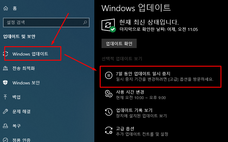 기본적으로 윈도우 업데이트 기능을 확인하는 방법은 설정앱을 이용하는 방법이 있습니다. 설정에서 윈도우 업데이트 관련 메뉴로 접근하게 됩니다. 여기서 윈도우 업데이트 정보를 확인할 수 있습니다. 정보 아래에는 7일 동안 윈도우 업데이트 끄기를 설정할 수 있는 부분이 있습니다.