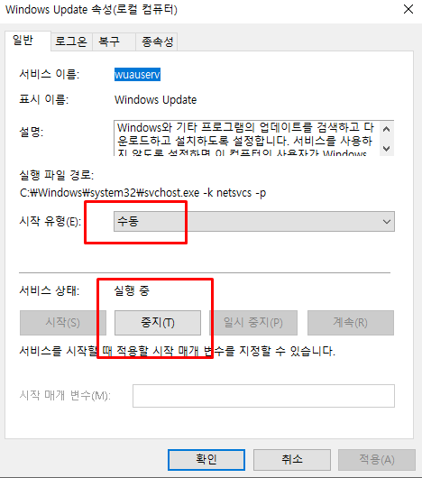 위 사진을 참고하여, 윈도우 업데이트 관련 설정을 중지로 하면, 기간에 상관없이 윈도우 업데이트를 끌 수 있습니다. 중요 업데이트에 대한 정보를 놓칠 수 있기 때문에 수시로 업데이트 정보를 확인하는 것이 도움이 될 수 있습니다.