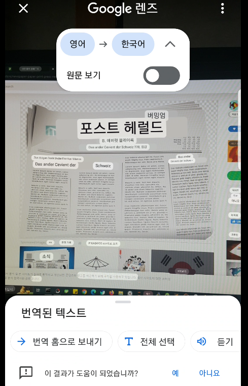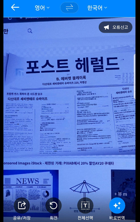 위 사진은 구글 번역기 카메라 번역을 이용해 임의의 영자 신문을 번역한 결과를 보여주고 있습니다. 인공지능이 확실하게 인식한 문자의 경우 잘 번역되어 출력되는 모습을 볼 수 있습니다.