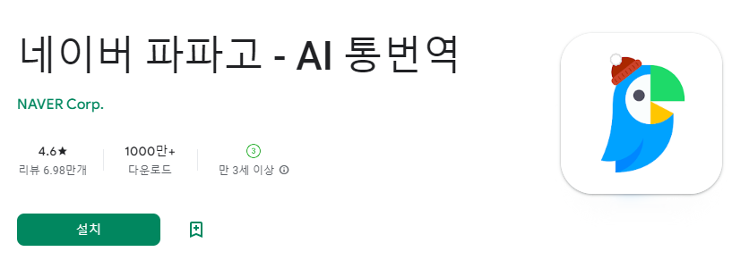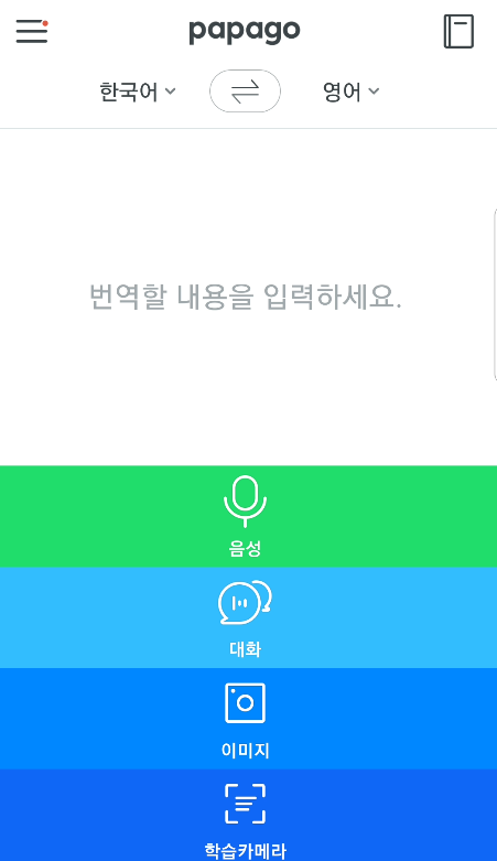 네이버 파파고 번역기 어플리케이션도 인공지능을 활용한 카메라 번역 기능을 제공하고 있습니다. 해당 기능을 이용하기 위해서는 스마트폰 어플리케이션을 설치해야 합니다. 구글 플레이 스토어에서 해당 앱을 찾을 수 있습니다. 설치된 어플을 실행하면 번역할 내용(텍스트)입력부분 아래 음성 / 대화 / 이미지 / 학습카메라에 대한 내용을 확인할 수 있습니다.