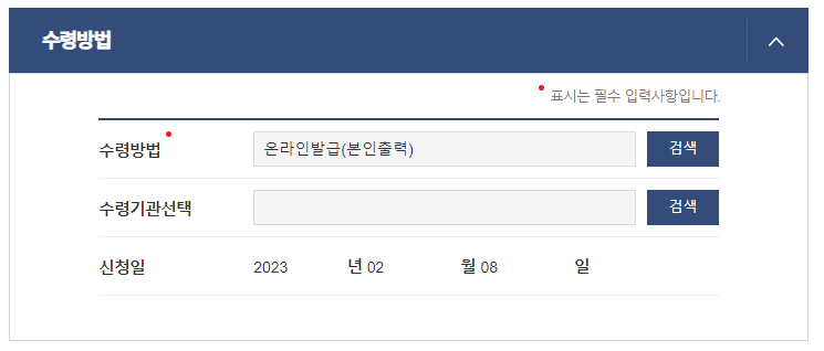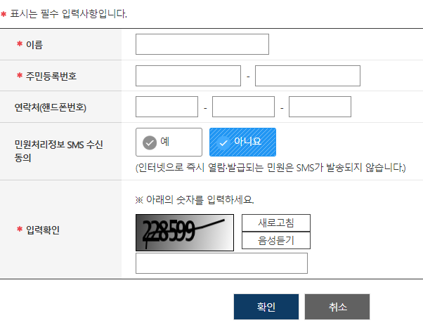 '동의합니다.'를 선택한 후, '비회원 신청 정보입력'의 모든 내용을 기입하게 된다면 [확인] 버튼을 선택합니다. 확인 후, 신청내용 / 수령방법을 선택하면 최종적으로 '민원신청하기'를 마무리할 수 있습니다.
