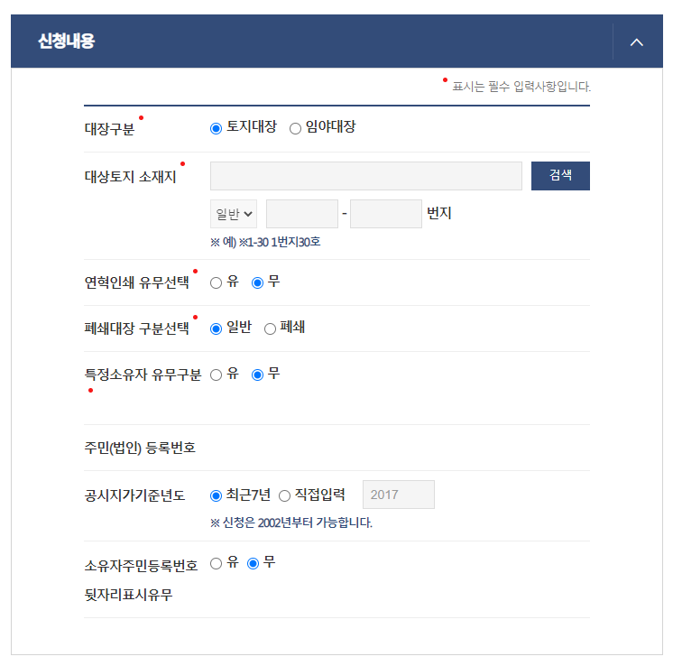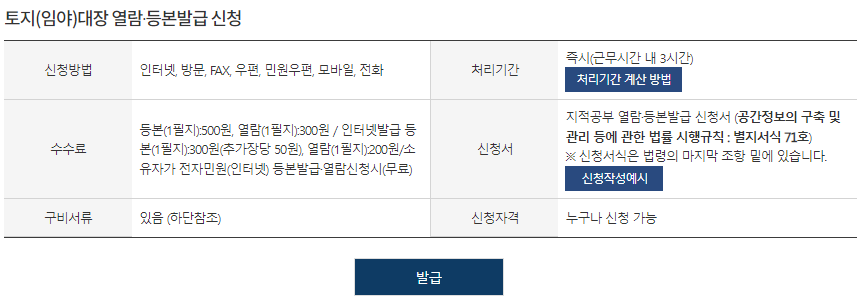 해당 토지대장 발급 페이지의 민원안내 및 신청에는 신청방법 / 처리기간 / 수수료 / 신청서 / 구비서류 / 신청자격에 대한 정보를 확인할 수 있습니다. 소유자 본인의 경우 수수료 없이 이용이 가능하지만, 그렇지 않은 경우 수수료가 발생할 수 있습니다.