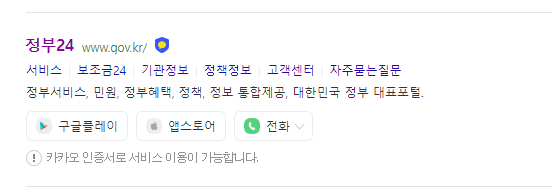 다음 검색 포털을 이용해 정부 24 홈페이지를 찾을 수 있습니다. 대표되는 사이트는 가장 먼저 보이기 때문에 쉽게 찾아볼 수 있습니다.