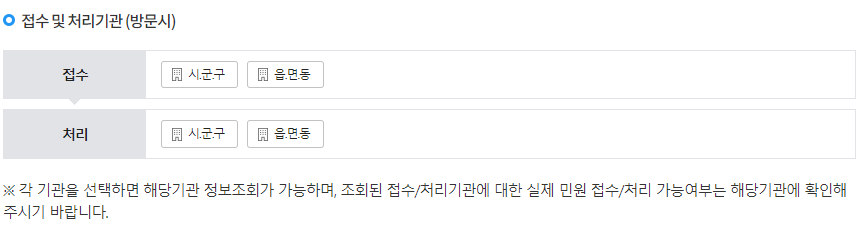 2번에서 알게 된 내용을 토대로 토지대장 발급 페이지로 이동할 수 있습니다. 해당 페이지에는 민원안내 및 신청 / 기본정보 / 참고정보에 대한 내용이 안내되어 있습니다. '기본 정보' 중 '접수 및 처리기관(방문시)'를 이용하면 민원 신청을 위해 방문할 수 있는 지역별 기관을 확인할 수 있습니다.